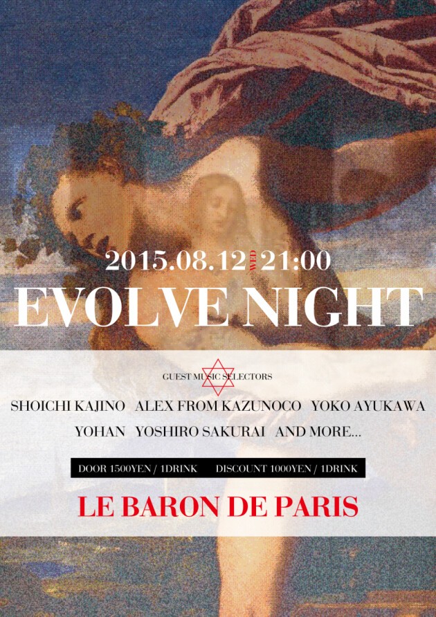 数々のファッションショーや有名ブランドのパーティーで腕を鳴らしてきたDJ陣。その確かな腕とセンスでファッショナブルな夜を創り上げる。進化や発展を遂げるとき、そこには確固たる意思が必要。あと、ちょっとしたラッキー。ラッキーはなにかを求める意思の道中にしばしば落ちているもの、それに気がつけるかどうか。来なければ、なにも変わらない。そんな夜、EVOLVE NIGHT