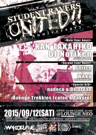 和光Rave!!が主催する学生、若手DJの祭典「STUDENT RAVERS UNITED!!」も今回で1周年!今回のSRUはLOUNGE NEO様にお引っ越しとSRU1周年記念祭ということで8時間の超拡大版でお届けします!