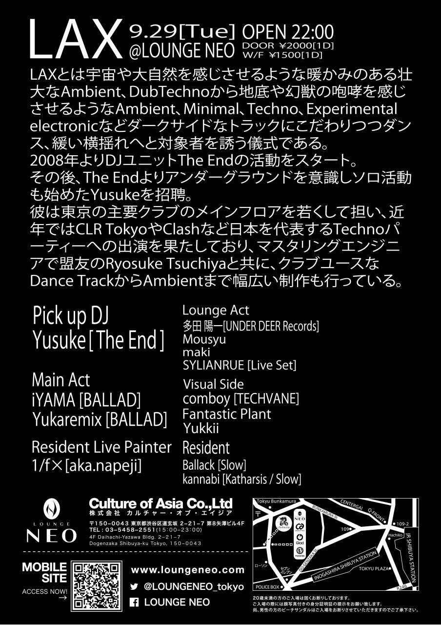 LAXとは時に暖かくて穏やかなAmbient、Deep House、Minimal等による心地の良い空間で友誼のために盃を交わす場であり、時に冷酷でドープなTechno、Minimalによる異質空間で皆が体を揺らす場である。