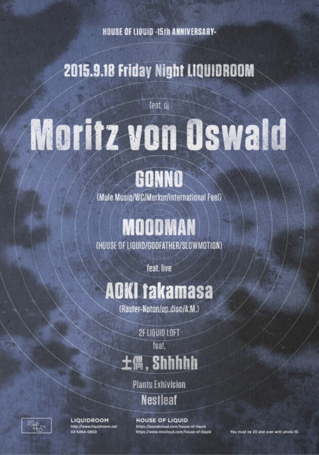 歌舞伎町時代のLIQUIDROOMにはじまり、さまざまなダンス・ミュージックの”ハウス”を提示してきたHOUSE OF LIQUIDも、今年でなんと15周年! 今回はベーシック・チャンネルやリズム&サウンド、そして現在の”トリオ”名義の作品に至るまで、ミニマル・テクノ、ダブなどベルリンのエレクトロニック・ミュージックの方向性を作り出し続けている、まさに音響面でのドン、モーリッツ・フォン・オズワルドを招いての開催。現テクノ・シーンの最高のプロデューサーとも称されるリカルド・ヴィラロボス、そして昨年のLIQUIDROOMでの共演も記憶に新しいアフロビートの伝説的ドラマー、トニー・アレンともに”トリオ”名義で『Sounding Lines』をリリースしたばかりのジャスト・タイミングでの来日となる。また共演には、〈Raster-Norton〉のリリースなどが、ベルリンをはじめ世界的に高い評価を受けるAOKI takamasaがライヴにて出演。さらにDJには、ニュー・アルバムをリリースしたばかり、そしてDJハーヴィーらがリリースする〈International Feel〉からの世界的ヒットも記憶に新しい、GONNOが登場。そして、そして、HOLと言えば忘れてはなりません、なんとDJ生活25周年を迎えるという活動の節目の年でもあるレジデントDJ、MOODMAN!!!(河村祐介)