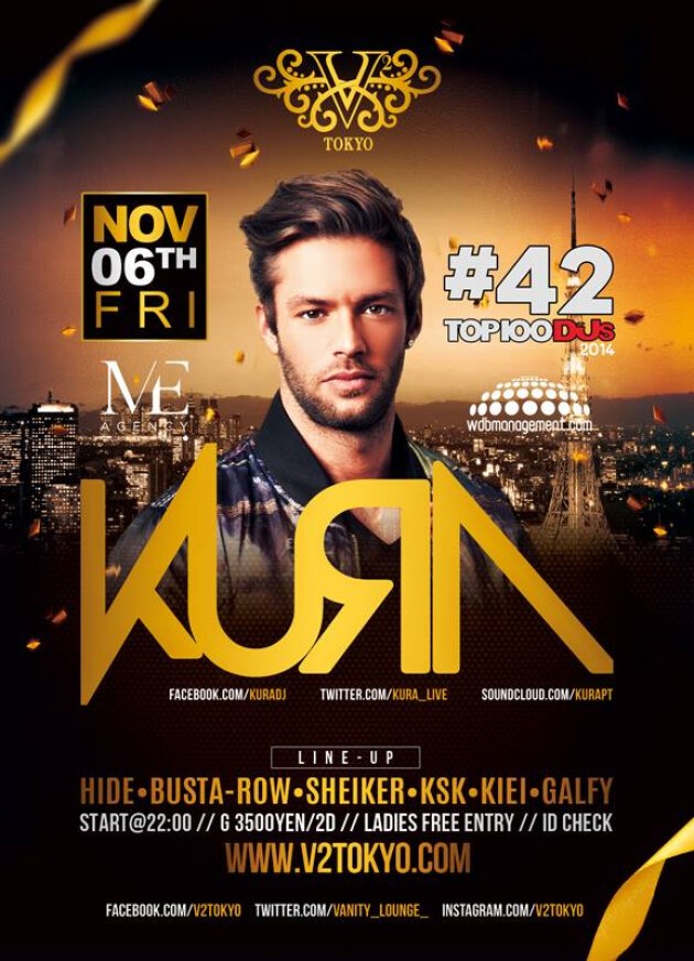 ★★11/6(金)のV2 TOKYOに2014年DJ Mag#42位にランクインした大注目株の超イケメンDJ『KURA』がSpecial Guestとして再び登場!★★