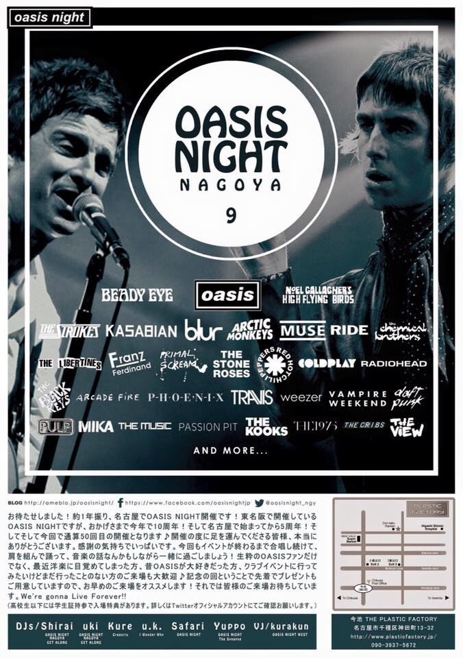 OASIS NIGHTとは「oasisの曲を爆音で聴いてみんなで大合唱したい,一緒に踊りまくりたい」「けど普通のロック•クラブイベントじゃoasis、UKロックがあまりかからない…」「なら自分たちでやってやろうじゃないか!」と東名阪で開催しているクラブイベントです!