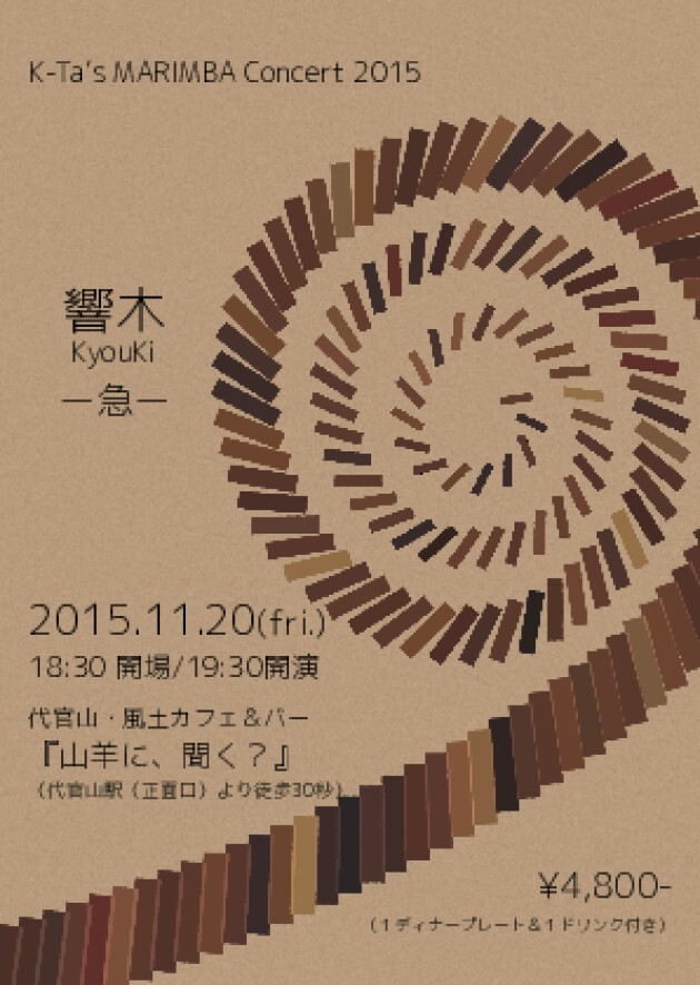 大好評の響木ー序破そして、急。 ここに一つの節目を刻み、次なる舞台への道標がみえ隠れする一夜。Marimbaの響きを中心に展開される音絵巻。その音は渦を巻き、その深淵にたどり着く・・・その時生まれるのはいったい何者か。ルーツに立ち返り、新たに歩き始めた響木第一期最終章。