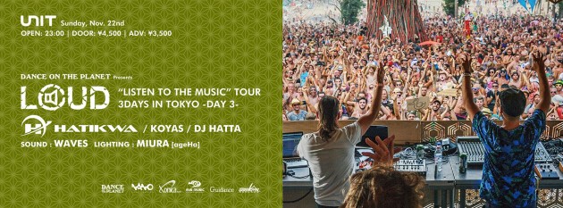 新世代のサイケデリックアイコン。前代未聞の東京3DAYS来日決定!!ハンガリーのOZORA、ポルトガルのBOOMなど世界の名だたる野外フェスを総ナメにし、今最も興味深く、ホットなアーティスト"LOUD"が11月にいよいよ日本で初の本格的なツアーを始動する。オールドスクールなトランスの名曲と、最新のカッティングエッジなサウンドを融合したマッシュアップ的手法から生み出されるキラートラックは破壊力抜群。今回WOMB、ageHa、UNITと東京のビッグビッグクラブで3夜連続、前代未聞のツアーを敢行する。ツアー最終日となる11月21日日曜祝前日のUNITではゲストアクトとしてプログレッシブ・ミニマルを標榜しドイツを中心に活躍を広げるHATIKWAが初来日の共演。サブフロアのUNICEはオリジナリティ溢れるパーティーメイクで定評のあるGuidanceがオーガナイズ。