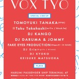 バンドで独自のスタイルを貫くShigeoJDと今年活動を休止した”DEXPISTOLS”での活躍も記憶に新しいDJ MAARからなる今最注目のユニット”FAKE EYES PRODUCTION”の出演も決定。また、“Dream" / "E-girls"での活動の他本格DJとしてめきめきと頭角を表して来た"DJ Erie”やこれまでに驚異的なセールスを記録しているMIX CDシリーズを世に放ち続けキュートなルックスとキャラクターからは想像ができない程パワフルなプレイを見せる “DJ KYOKO”などの超豪華アーティストが一同に集結しお送りする“VOX TYO”。