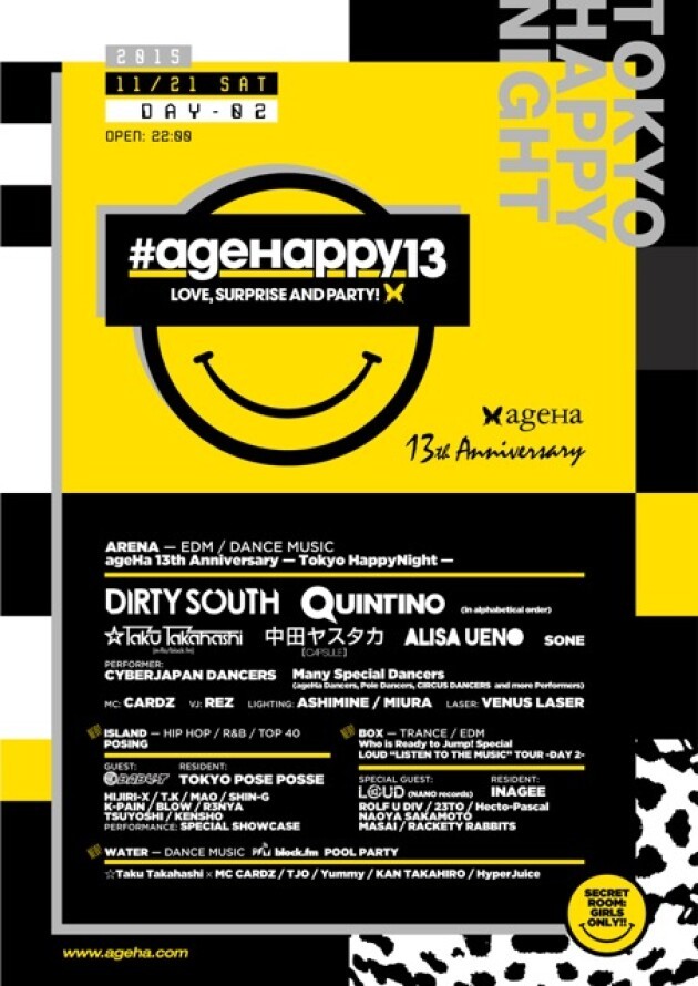 ageHa 13th Anniversary 「#ageHappy13」 日本最大のクラブイベント「ageHa」13周年パーティー開催決定!HAPPYをテーマに開催される驚きと喜びの夜!