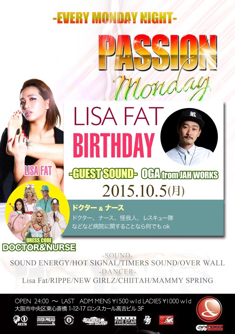 【毎週月曜パッションマンデー】10/5(月)☆月曜カモンは『PASSION MONDAY』☆☆LISA FAT BIRTHDAY BASH★★GUEST SOUNDにOGA from JAH WORKSが登場☆☆CLUB CAMONのLINE公式アカウント登録で割引特典あり★★