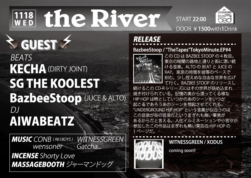 HIPHOPのビートメイカーを招いて、自らのBEATでDJしてもらうPARTYです! 今回は平塚のビートメイカー KECHA (DIRTY JOINT), SG THE KOOLEST そしてアルバムを発表したビートメイカーALTOとMCのJUCEのBazbeeStoopが登場!