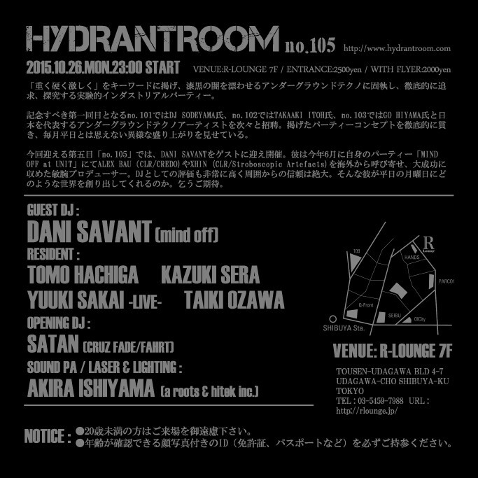 今回迎える第五回目「no.105」では、DANI SAVANTをゲストに迎え開催。彼は今年6月に自身のパーティー「MIND OFF at UNIT」にてALEX BAU(CLR/CREDO)やXHIN (CLR/Stroboscopic Artefacts)を海外から呼び寄せ、大成功に収めた敏腕プロデューサー。DJとしての評価も非常に高く周囲からの信頼は絶大。そんな彼が平日の月曜日にどのような世界を創り出してくれるのか。乞うご期待。