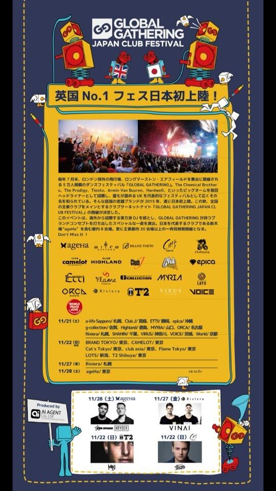 UK を代表するダンスフェスティバル「GLOBAL GATHRING(グローバル・ギャザリング)」が 2015 年、日本に初上陸! この秋、全国の主要クラブをメインとするクラブサーキットナイト「GLOBAL GATHERING JAPAN CLUB FESTIVAL」の開催が決定!