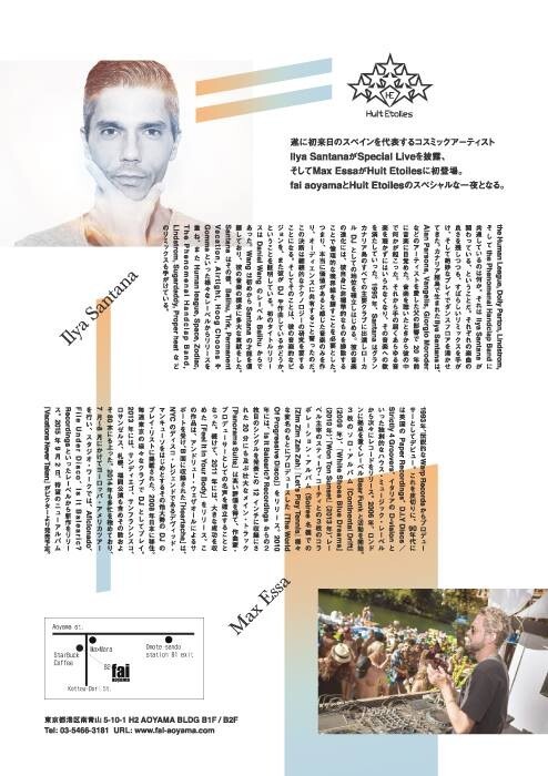 遂に初来日のスペインを代表するコスミックアーティストIiya SantanaがSpecial Liveを披露、そしてMax EssaがHuit Etoilesに初登場。 Fai AoyamaとHuit Etoilesのスペシャルな一夜となる。