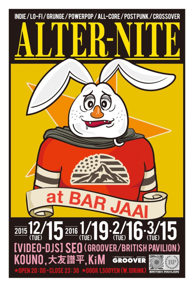 USインディー/オルタナ/ラウドロックを中心に、リクエストに応えながら新旧ミュージック・ビデオをプレイするDJイベント"ALTER-NITE"、大阪は東心斎橋BAR JAAIにて、毎月第3火曜日に開催中!エヴァーロングに輝き続ける名曲の数々が、爆音でフロアに鳴り響く!!