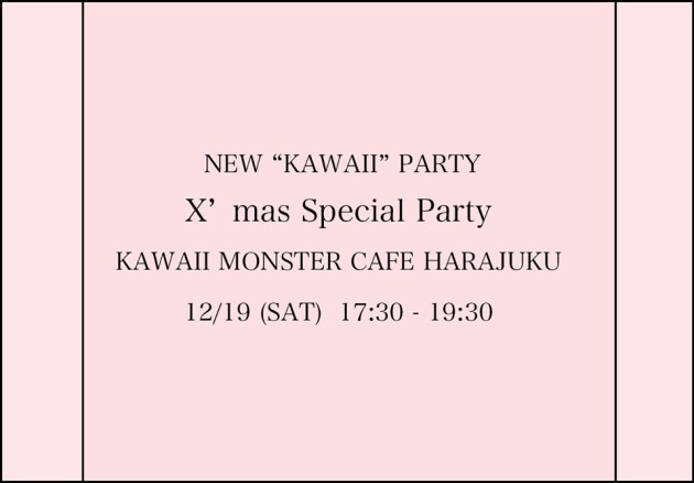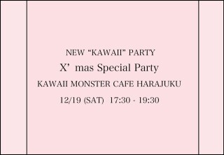 NEW “KAWAII” PARTYとは世界の共通語となった”KAWAII”を更に新しい切り口で展開し、”NEW KAWAII”として1人1人の女の子たちの新しい出会いや体験そのものを、提案するプロジェクトです。コンセプトの詳細は、詳細につきましては12月19日(土)にKAWAII MONSTER CAFÉで開催されるXʼmasパーティーイベントして発表致します。