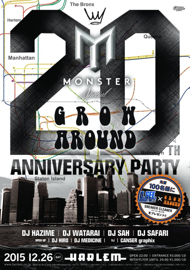 HARLEMの音の根幹をなすREGULAR PARTYを牽引する5TOP DJ、HAZIME, WATARAI, KOYA, KANGO, SAFARIが一堂に集まり土曜日を完全燃焼させる"MONSTER"。圧倒的なパワーと爆発力で他の追随を許さない。5th sat.には世界的に活躍するDJ LEADが登場。