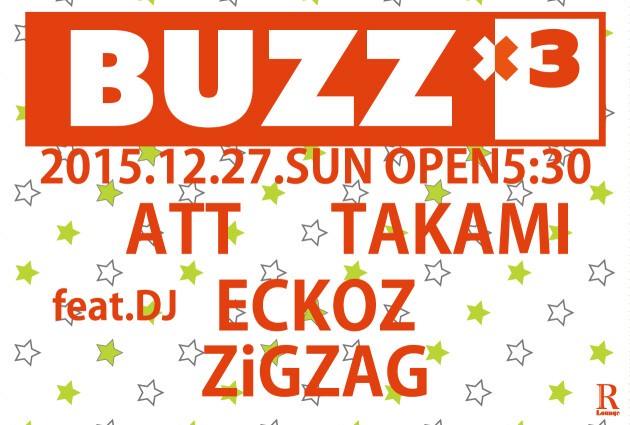 DJ ATTとTAKAMI,が繰り出すのがアフターアワーズの決定板「BUZZ×3」開催!!!2015年最後の開催は人気ハードテクノパーティー Fixから"ECKOZ"と注目の若手デュオ"ZiGZAG"が登場。