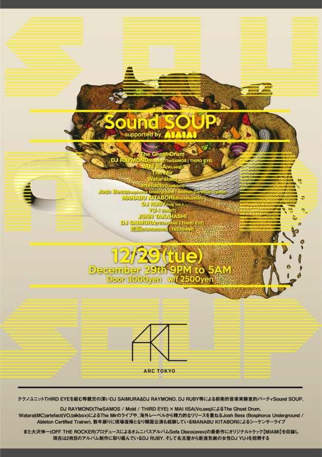 テクノユニットTHIRD EYEを組む等親交の深いDJ SAIMURA&DJ RAYMOND、DJ RUBY等による前衛的音楽実験室的パーティSound SOUP。