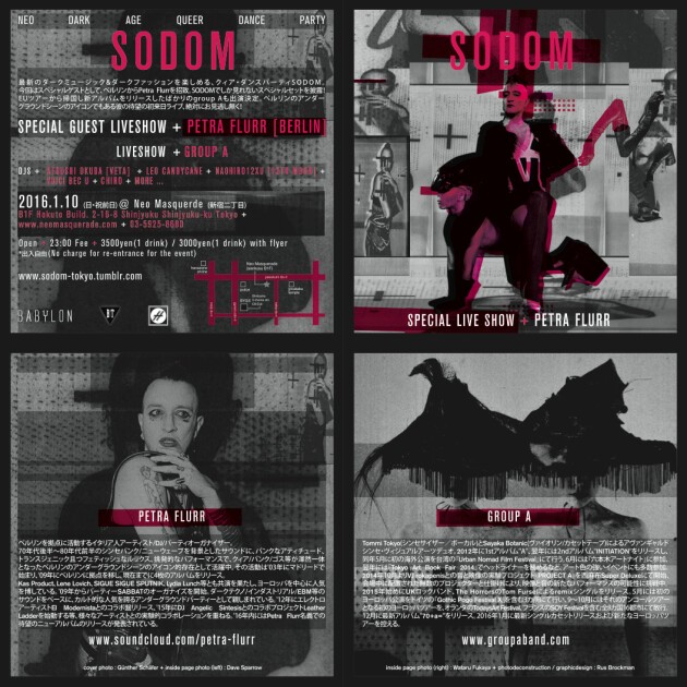 Neo dark age queer dance party SODOM: a night of contemporary dark music and dark fashion. We return with a special Guest: Petra Flurr from Berlin - who will perform a special live set especially for SODOM. After their europe tour and the release of their new album,our favorite duo groupA is once more performing at Sodom. Please don’t miss the underground Berlin icon’s first gig in Japan!
