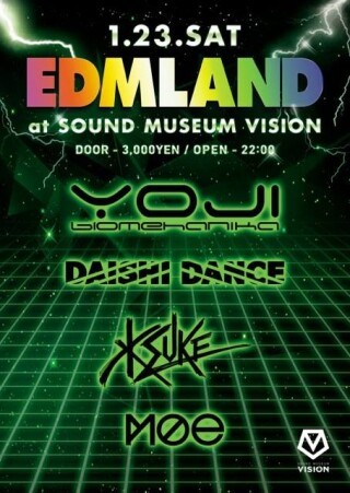 VISIONの1月はニューパーティラッシュとなる。この日は世界中のダンスシーンを席巻するEDM主体のパーティEDM LANDがスタートする。DJには日本のクラブ黎明期からいち早く海外で活躍し、DJ MAGのランキングでもお馴染みとなったYOJI BIOMEHANIKAを筆頭にDAISHI DANCE、KSUKEなど旬なDJが揃う。世界標準のパーティとしての1歩がこの日始まる。