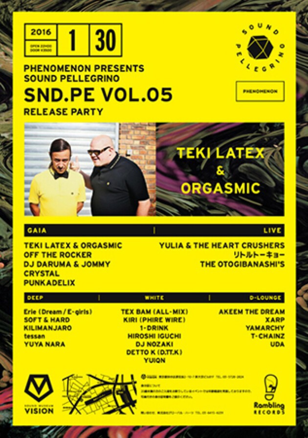 ブランドコンセプトは、「音楽」として、ダンスミュージックを軸にさまざまな音楽をMIXして洋服に形を変えて表現している”PHENOMENON”が今回Para OneやSurkin、Panteros666を送り出した世界屈指のレーベルSOUND PELLEGRINOのTEKI LATEXとORGASMICを招いて開催されるパーティ『SOUND PELLEGRINO”SND.PE VOL5”RELASE PARTY』。音楽と音楽を取り巻くカルチャーが融合されるこのパーティがトレンドセッターの注目となるであろう。