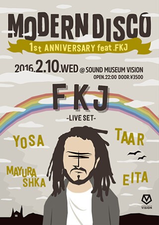 VISIONに新たな魅力をもたらすパーティとして、盛りあがりを見せ続ける“MODERN DISCO”。これまでにBONDAXMOONBOOTSといった初来日の新進気鋭のアーティストに加えDIMITRI FROM PARIS といった御所DJを迎えて開催してきたが、記念すべきアニバーサリーの今回は昨今のフレンチハウスシーンで多大な影響を与えている、フランスのハウスミュージックレーベル『Roche Musique』を率いる『French Kiwi Juice』こと『FKJ』が登場する。