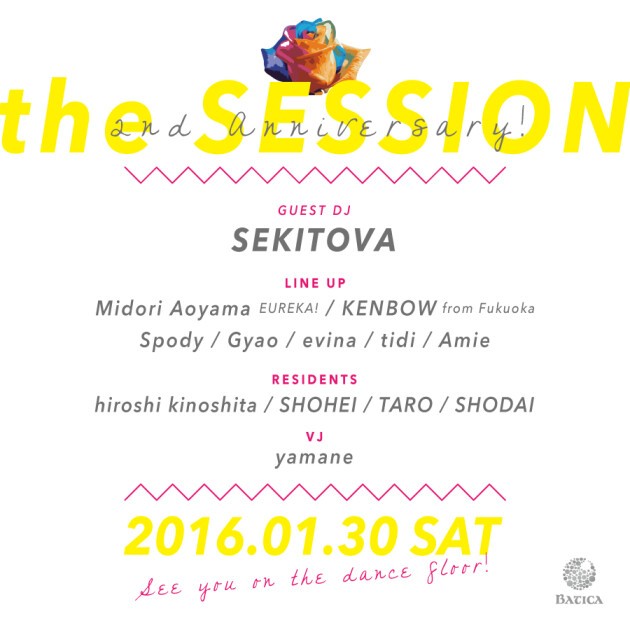 2014年1月にHOUSE・TECHNO・DISCOを軸に据え、恵比寿BATICAにて始動したパーティー、“the SESSION”。過去にGONNO、ALYN、MONKEY TIMERS、Boys Get Heart、EITA等をはじめとする国内の実力派DJ・PRODUCERを多数招聘してきた本パーティーが2周年を迎える。