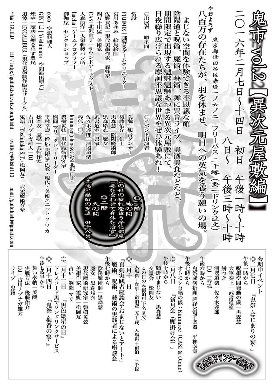 ”まじない空間を体験できる不思議な館” http://guildkishi.wix.com/kishi 陰陽道と呪術、魔術、美術品、舞に異音ライブ、美酒美食ete・・ 期間限定で出現する魑魅魍魎あつまる異次元屋敷にて、日夜繰り広げられる摩訶不思議な世界をぜひ体験あれ!