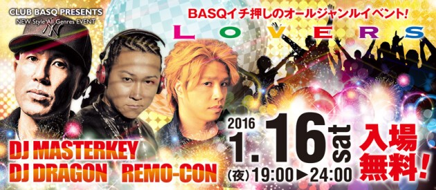 CLUB BASQ,いち押しプッシュ、プッシュ!!のイベント『LOVERS』!! 県内外の最強DJ陣が、エッジの効いた選曲で土曜の夜をロック!! また、世界、そして日本国内で活躍中のDJ MASTERKEY/DJ DRAGON/DJ Remo-con」がそれぞれ、MASH UPしたトラックを使いフロアを最高調に誘います。スペシャルイベント『LOVERS』!! なんと入場は、無料!! 是非お待ちしております。