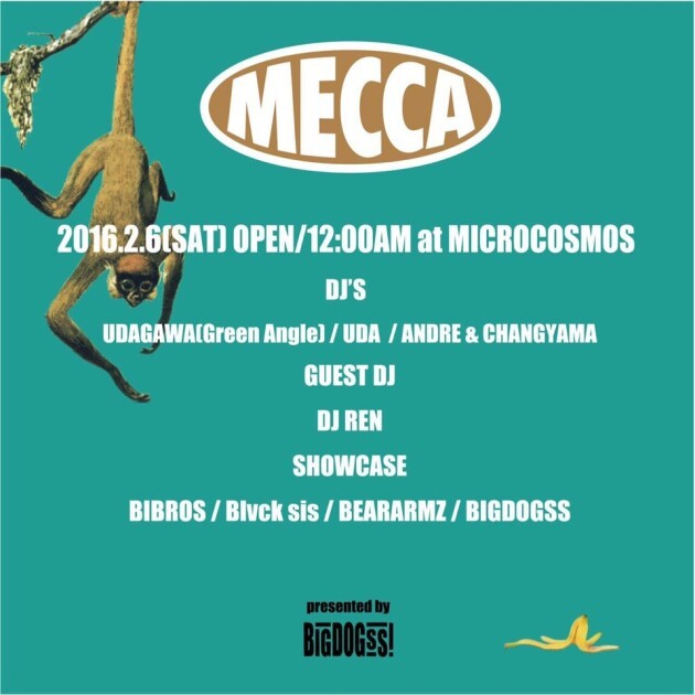 毎回ハイクオリティなパフォーマンスと、楽しい空気感が溢れるMECCA。現在のストリートとダンスをつなぐ最重要チーム"BIGDOGSS"のホームイ ベント。今回はGUEST DJ にDJ RENを迎え、SHOW CASEでは、BIBROS、Blvcktenn sis、BEARARMZ、BIGDOGSSが登場。熱い夜になることは間違いないだろう。