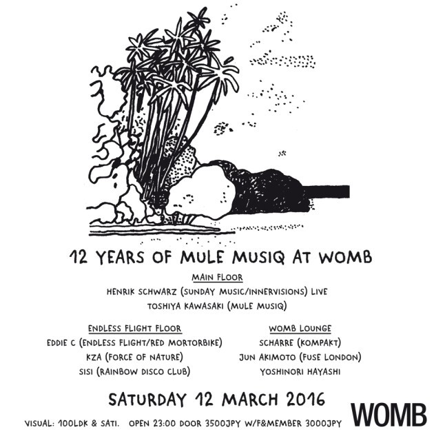 12年目を迎えた MULE MUSIQ が 今年も WOMB にてスペシャルなパーティーを開催。世界中のクラブやフェスティバルから引っ張りだこの HENRIK SCHWARZ がライブセットで出演。また ENDLESS FLIGHT LOUNGE と称した VIP LOUNGE には、ローモー / エディット / ディスコ・シーンにおける最重要人物の1人、EDDIE C が登場する。また4月末に開催される RAINBOW DISCO CLUB のレジデント SISI や FUSE LONDON での活躍が目覚ましい JUN AKIMOTO、2015年に UK の GOING GOOD RECORDS からリリースされた ”END OF THE EDGE EP”(邦題「終端イーピー」)で JUNO PLUS BEST OF 2015 の6位にランクインされた YOSHINORI HAYASHI が登場。日本を代表する MULE MUSIQ の祝祭に華を添える素晴らしいメンバーがクレジットされた。
