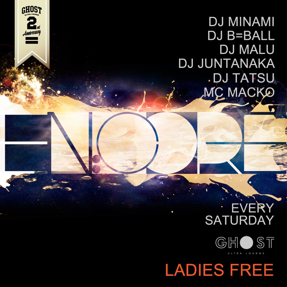 毎週土曜日のGHOSTは大阪のクラブシーンを常に最先端へ引っ張って来たDJ陣を揃え、HIP HOPをベースに"今一番クラブで盛り上がる曲"をオープンフォーマットスタイルでお届けする『EN:CORE』!HIP HOP好きのアナタはもちろん、海外のクラブシーンを追いかけるSoundCloud中毒のアナタもきっと満足できる、唯一無二の内容でアメ村の土曜日の夜を彩ります。