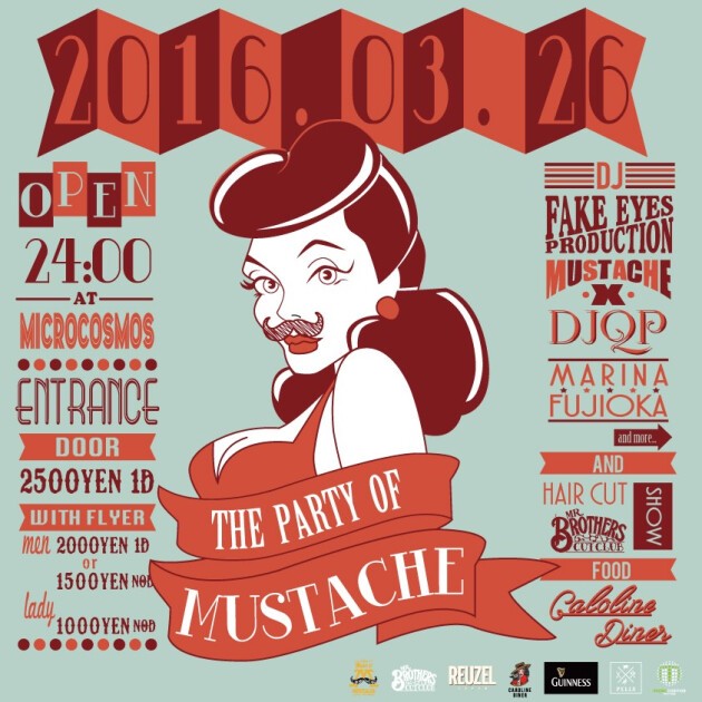 第三回目となる本Party、今回も本格口髭ブランドマスターオブマスタッシュ(Master of Mustache) の協力のもとゲストDJには、Master of mustacheのメンバーでもある、ShigeoJD (SBK / The Samos / Mold) とMofMとの親交の深い Supermaar aka DJ MAAR (ex. DEXPISTOLS)からなるFake Eyes Production を迎え、さらに東京初の口髭(Mustache)のソーシャルクラブ“Black Mustache Social Club”を運営する Mustache X(SOFTMACHINE)。