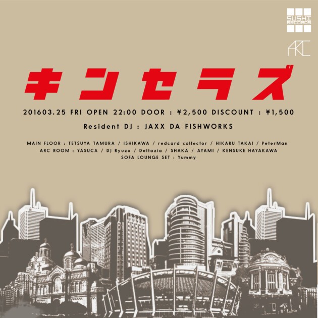 SUSHI RECORDSで活動するTETSUYA TAMURA(Remo-conとして知られる)はTechno、Bass Music制作に没頭するISHIKAWA、先日Sonny Whartonの公式Remixをリリースしたredcard collector、SUSHI DJ HIKARU TAKAI等をメインフロアーに、そしてセカンドフロアー ARC ROOMにはHed Kandiで活躍するYASUCA、DJ Ryuzoを筆頭に落ち着いた空間を演出し、Yummyがキンセラズで貴重な"SOFA LOUNGE SET"を披露する。
