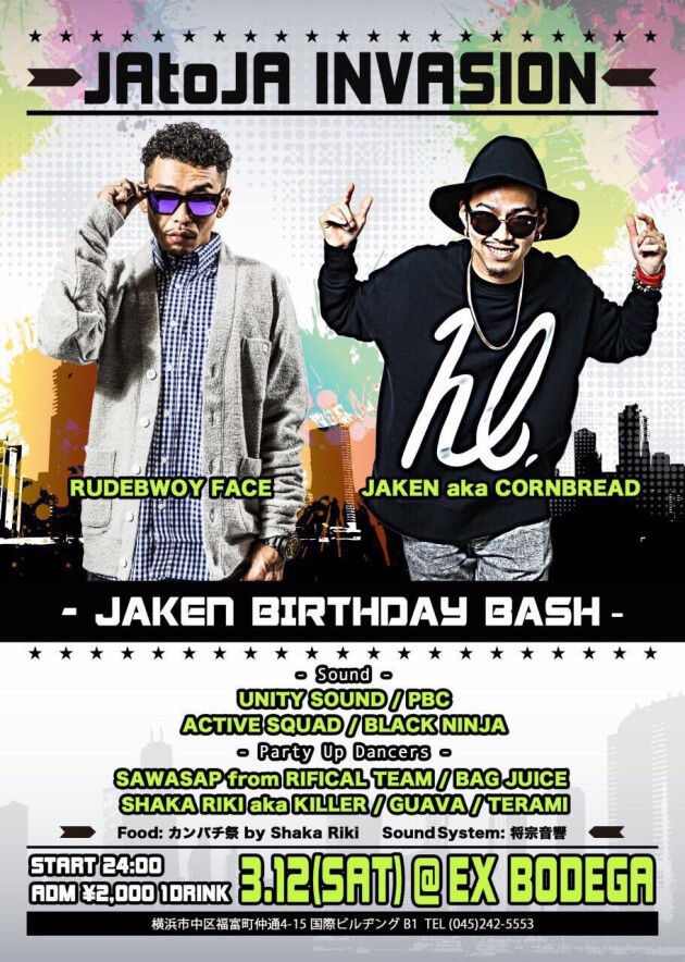 JAKEN birthdayを横浜exbodegaで開催。 ジャマイカより帰国したばかりのJAKENを地元アーティストと供に盛り上がります! rudebwoyfaceの出演決定! 将宗音響