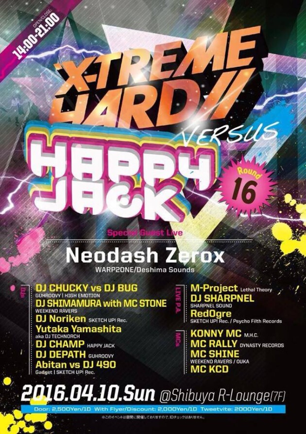 8年目に突入した東京ハードコアパーティー頂上決戦が渋谷のR Loungeで開戦! 東京最狂「X-TREME HARD」と東京最幸「HAPPY JACK」の激しいバトルに、「J-Core」と言う呼び名の名づけ親であるNeodash Zeroxがオランダから参戦!激闘の火蓋が切られる!