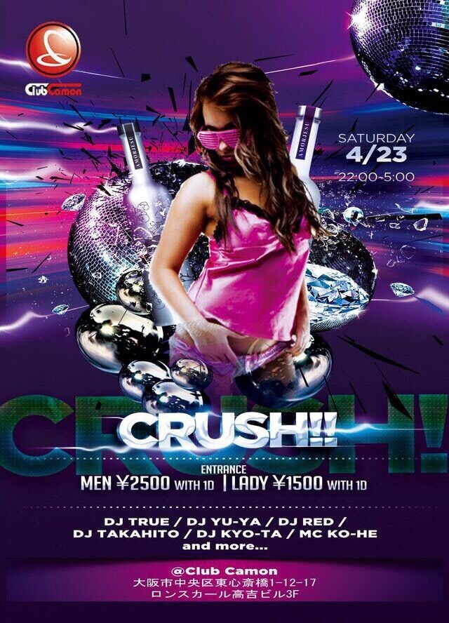 【CRUSH!!】4/23(土)☆オールジャンルパーティー『CRUSH!!』★★フライヤー持参で完全入場無料+1D付☆☆CLUB CAMONのLINE公式アカウント登録で割引特典あり★★