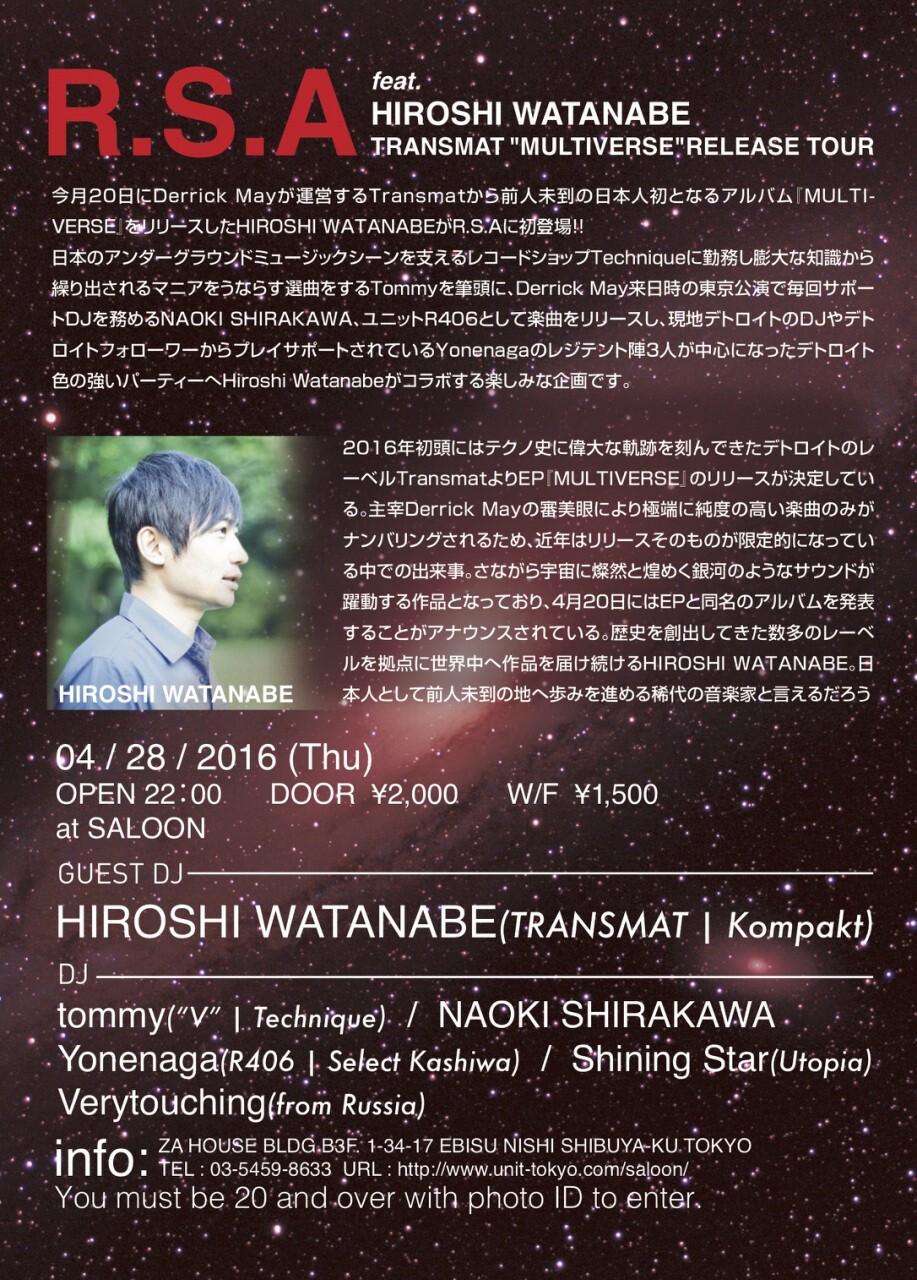 今月20日にDerrick Mayが運営するTransmatから前人未到の日本人初となるアルバム『Multiverse』をリリースしたHiroshi WatanabeがR.S.Aに初登場!!