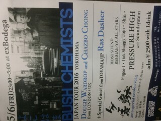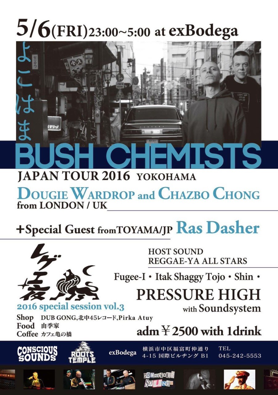横浜ex bodegaで毎月第一金曜日開催されている、レゲエ夜。PRESSURE HIGHの低音が響き渡る。 今回は特別な夜。LONDON/UK からBUSH CHEMISTS来日。 ShopもFoodも充実している夜です。