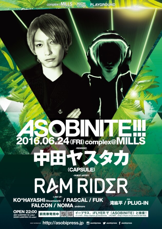 東京から福岡、さらに世界へエンターテインメントを拡散させるアソビシステムのフラッグシップパーティ「ASOBINITE!!!」が福岡MILLSで開催!稀代の音楽家として輝きを放つ中田ヤスタカ(CAPSULE)がレジデントを務め、福岡の実力派ラインナップが揃い踏みする。今回のゲストはアーティストのプロデュースや、TV、映画、舞台への楽曲提供、更に海外の大型フェスでの活躍が目覚ましいRAM RIDERが2年ぶりの来福! 毎回エンターテインメントのエッセンスを絞りきり期待を裏切らない盛り上がりを実現させる「ASOBINITE!!!」でアソバナイト!!!