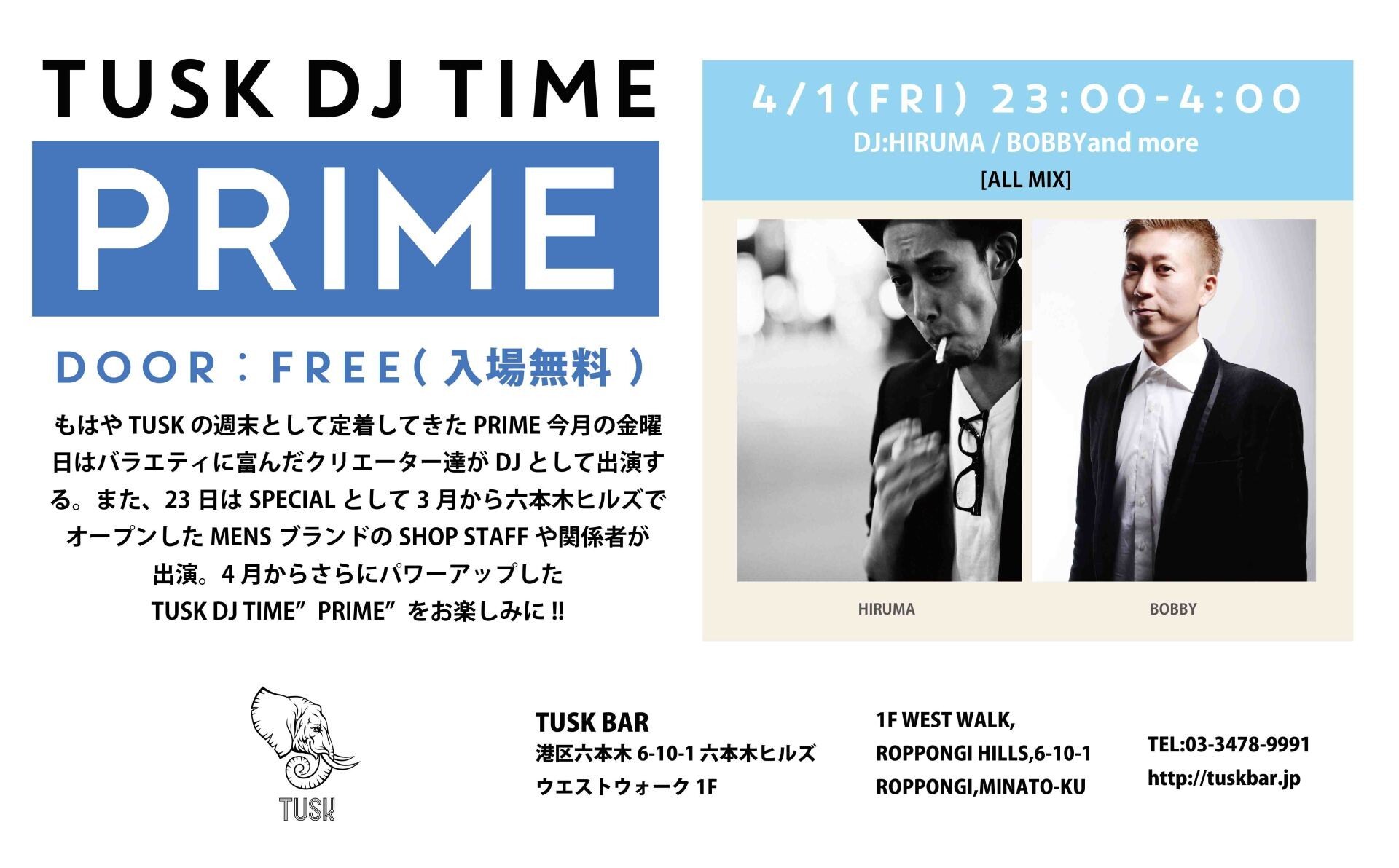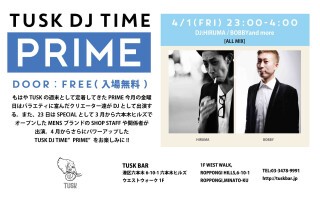 もはやTUSKの週末として定着してきたPRIME。 今月は金曜日はバラエティに富んだクリエーター達がDJとして出演する。 4月からさらにパワーアップしたTUSK DJ TIME”PRIME”をお楽しみに!!