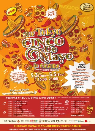 Cinco de Mayo se relanzará como un festival profesional de La gastronomía y cultura de toda América y moverá su ubicación en Tokio desde el parque de Yoyogi a Odaiba y en Osaka a Nagai Park. Este cambio le permitirá contar con artistas de primer nivel, tanto locales como del exterior, con el objetivo de ser el mejor festival latino en Asia.