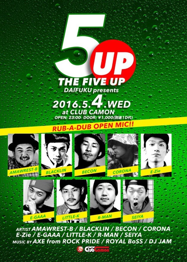 【5UP】5/4(水)(祝前日)☆ゴールデンウィーク特別企画★★DAIFUKU presents『5UP』☆☆レゲエアーティスト多数出演★★ラバダブオープンマイク☆☆CLUB CAMONのLINE公式アカウント登録で割引特典あり★★