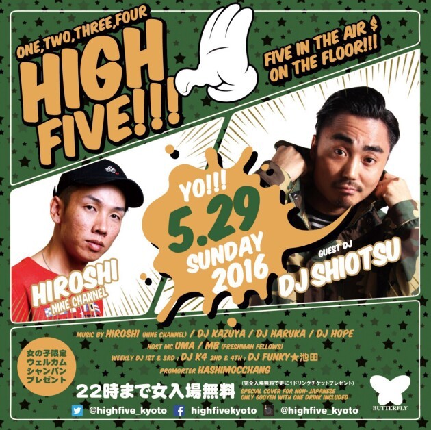 毎週日曜日に京都のベテランDJ Mr.CAMPとレゲエサウンドNINE CHANNELのHIROSHIによるNewパーティー"High FIVE !!!"がスタート!!