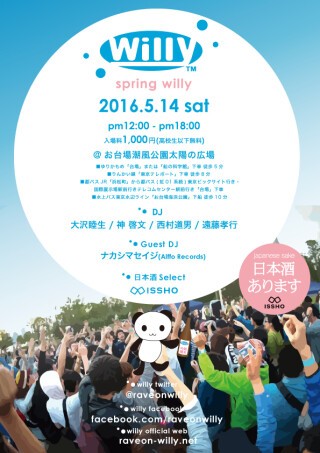 2016年最初のwillyは来月5/14(土)に開催!DJは大沢睦生、神啓文、西村道男、遠藤孝行。GuestDJにナカシマセイジ(Alffo Records)が出演!ISSHOによる日本酒の販売決定!初夏のお台場潮風公園で踊りましょう!
