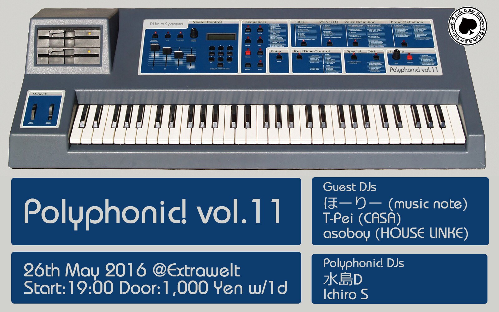 場所は都内でも有数のサウンドシステムを誇る神田の Cafe&Bar Extrawelt、19:00~終電くらいまで、チャージは1000円/1dとなります。