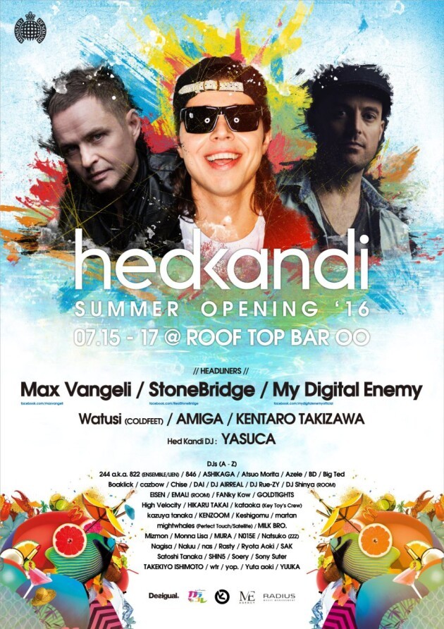 出演者にはスターDJ Max Vangeli、フューチャーハウス界のヒットメーカー My Digital Enemy等の豪華ラインナップが集結し、2日目のこの日はハウスレジェンド StoneBridgeが参戦!そして、日本のハウスミュージックを牽引し続ける重鎮 Watusi (COLDFEET)がHed Kandiに初登場!さらにKENTARO TAKIZAWA、YASUCAと申し分ない顔ぶれが揃う。