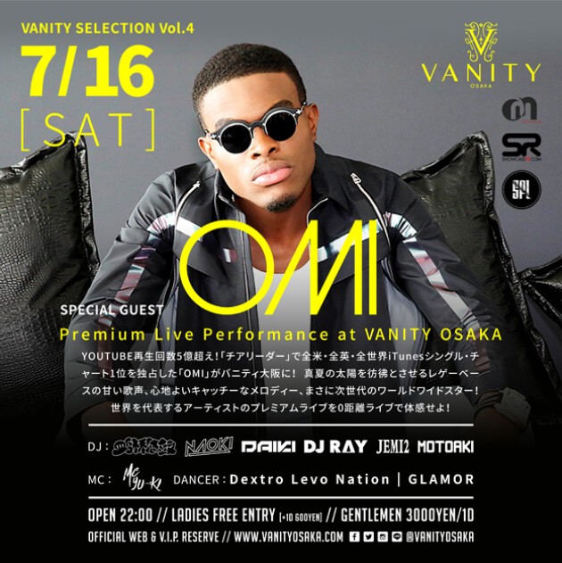 YOUTUBE再生回数5億超え!「チアリーダー」で全米・全英・全世界iTunesシングル・チャート1位を独占した「OMI」がバニティ大阪に!