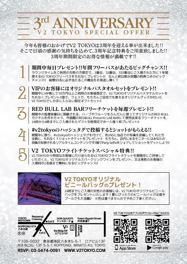 ②3周年期間中に限り、#V2TOKYO のハッシュタグをつけて各SNSに当店での写真を投稿してくれた方全員に、フロントにて1ショットチケットをプレゼント!