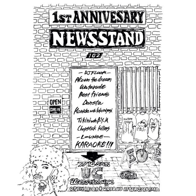 ●渋谷区道玄坂にて2015年にオープンしたNewsstand、1周年記念の今回、交流のあるアーティストを迎えパーティを開催致します。また、ラウンジスペースではカラオケも導入!是非Newsstandの1周年のお祝いに遊びに来て頂ければと思います。