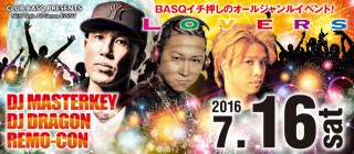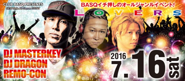 CLUB BASQ,いち押しプッシュ、プッシュ!!のイベント『LOVERS』!! 県内外の最強DJ陣が、エッジの効いた選曲で土曜の夜をロック!! また、世界、そして日本国内で活躍中のDJ MASTERKEY / DJ DRAGON / DJ Remo-conがそれぞれ、MASH UPしたトラックを使いフロアを最高調に誘います。スペシャルイベント『LOVERS』!! 是非お待ちしております。