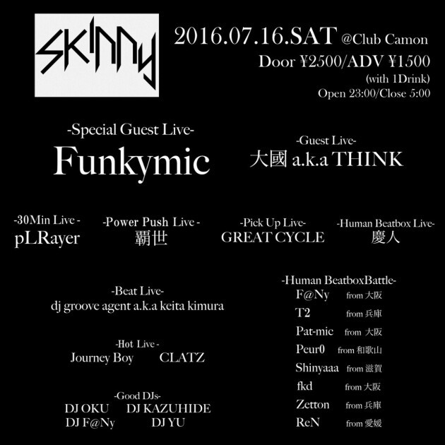 【SKINNY】7/16(土)☆HUMAN BEATBOX BATTLE & HIP HOP PARTY『SKINNY』☆☆SPECIAL GUEST LIVEにFunkymicが登場★★各都市から代表するヒューマンビートボクサー達によるバトルも開催☆☆さらにスキルフルなアーティストが多数登場★★
